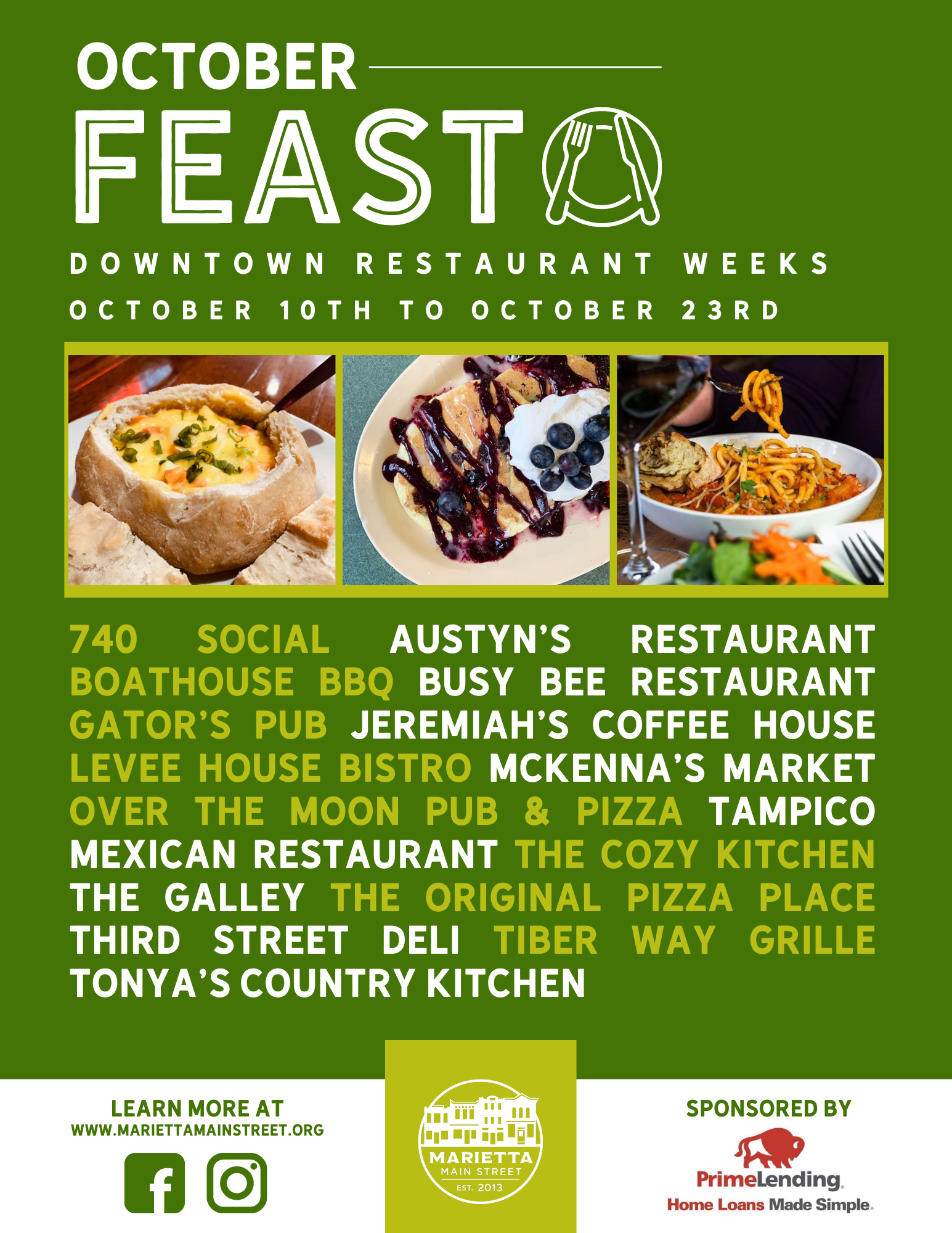Octoberfeast is our spin on Restaurant Week(s) in downtown Marietta! Scheduled from Sunday, October 10th to Saturday, October 23rd, this two-week-long celebration of participating downtown restaurants is sure to bring locals and tourists together to dine local!